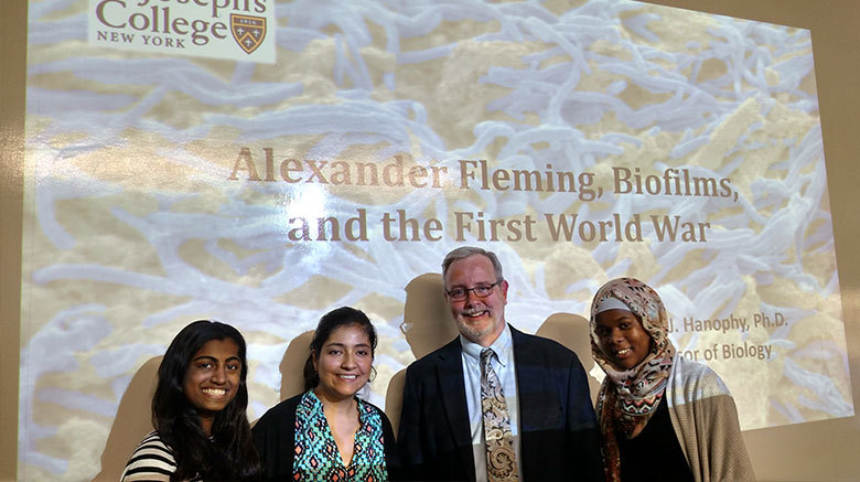 SJC Brooklyn biology professor Michael Hanophy, Ph.D., presented a lecture Oct. 18 on the origin of biofilm among the backdrop of World War I, as researched by Alexander Fleming — a influential scientist most famous for his discovery of penicillin.