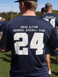 Baseball players wore “24” in memory of Gregg Alfano ’93.
