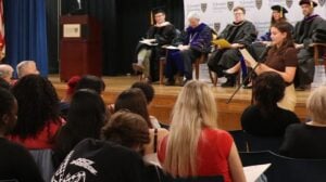 Wendy C. Turgeon, Ph.D., professor and associate chair of philosophy, speaks to students at the Long Island Campus ceremony.