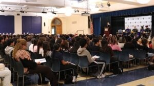 Brooklyn Campus SGA President Rachel Meltsin ’26 leads the Class of 2029 in the academic integrity pledge.